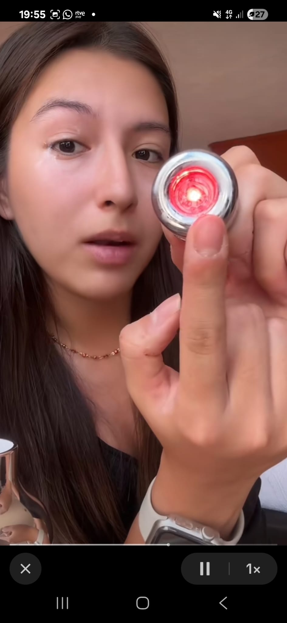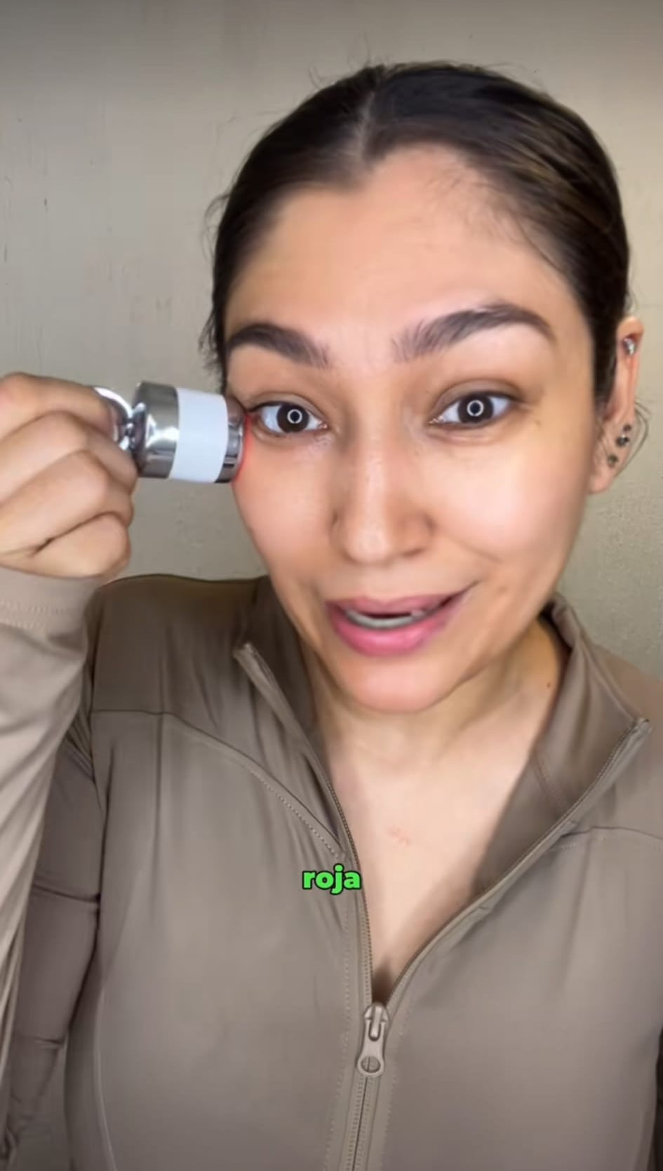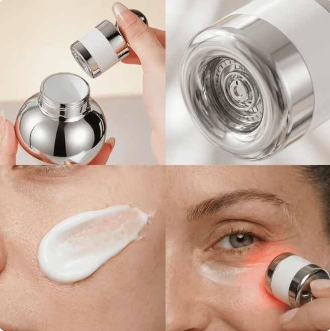 La crema con masajeador de luz roja combina tecnología LED activadora de colágeno con micro-vibración drenante para reafirmar, alisar y revitalizar el contorno de ojos desde la primera aplicación.
